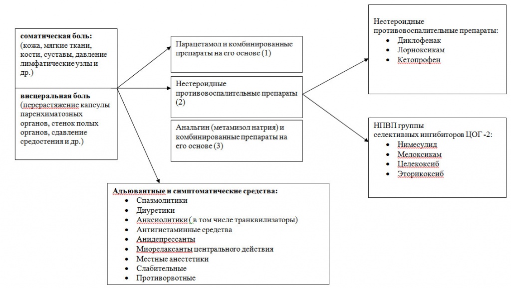 Рис. 3 Алгоритм фармакотерапии ноцицептивного хронического болевого синдрома слабой интенсивности (1-ая ступень)